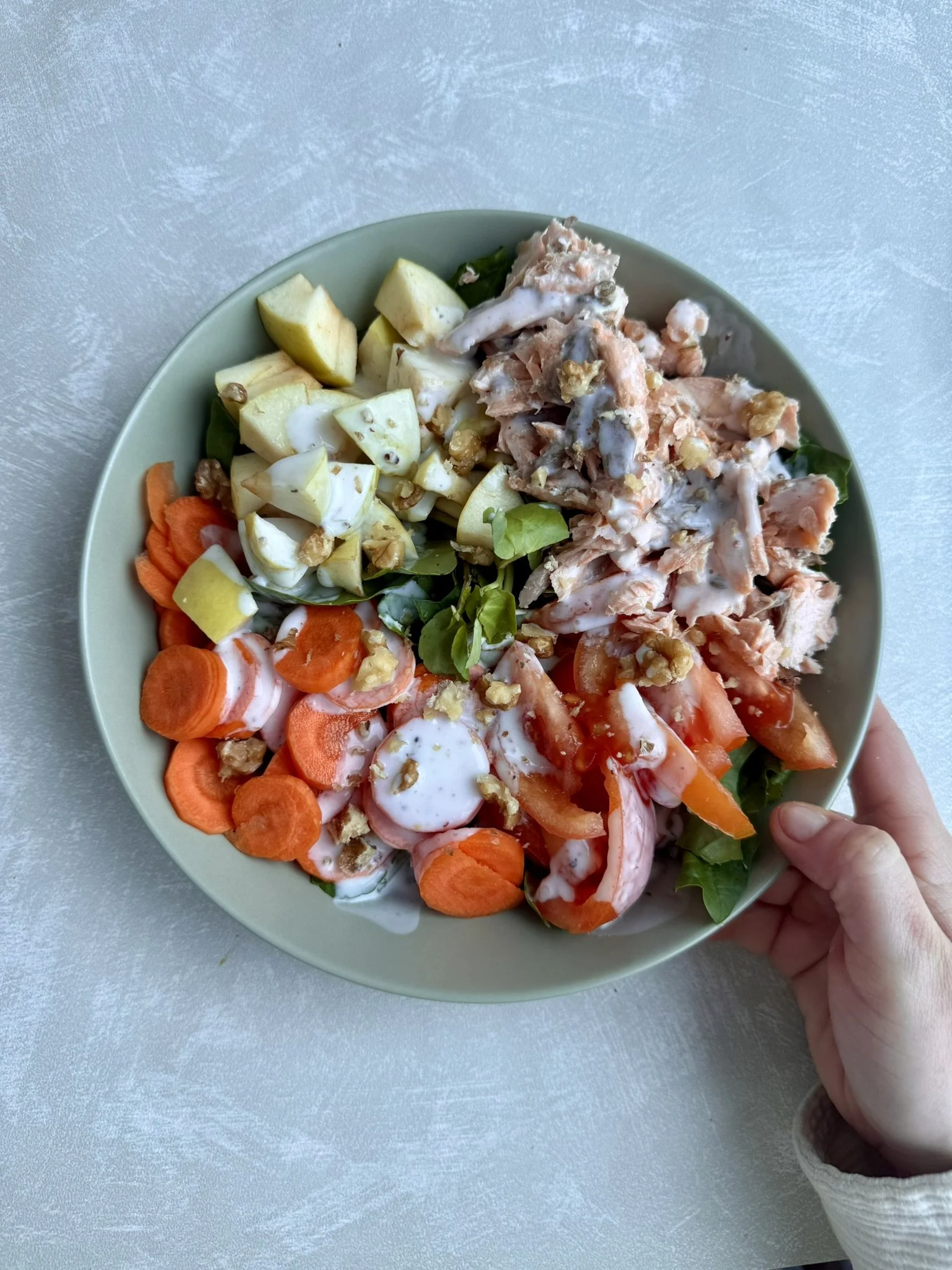 Misturei o kefir com sumo de limão, pimenta rosa e orégãos (dispensei o sal). Podem adicionar um fio de azeite e até raspa de limão, lima.