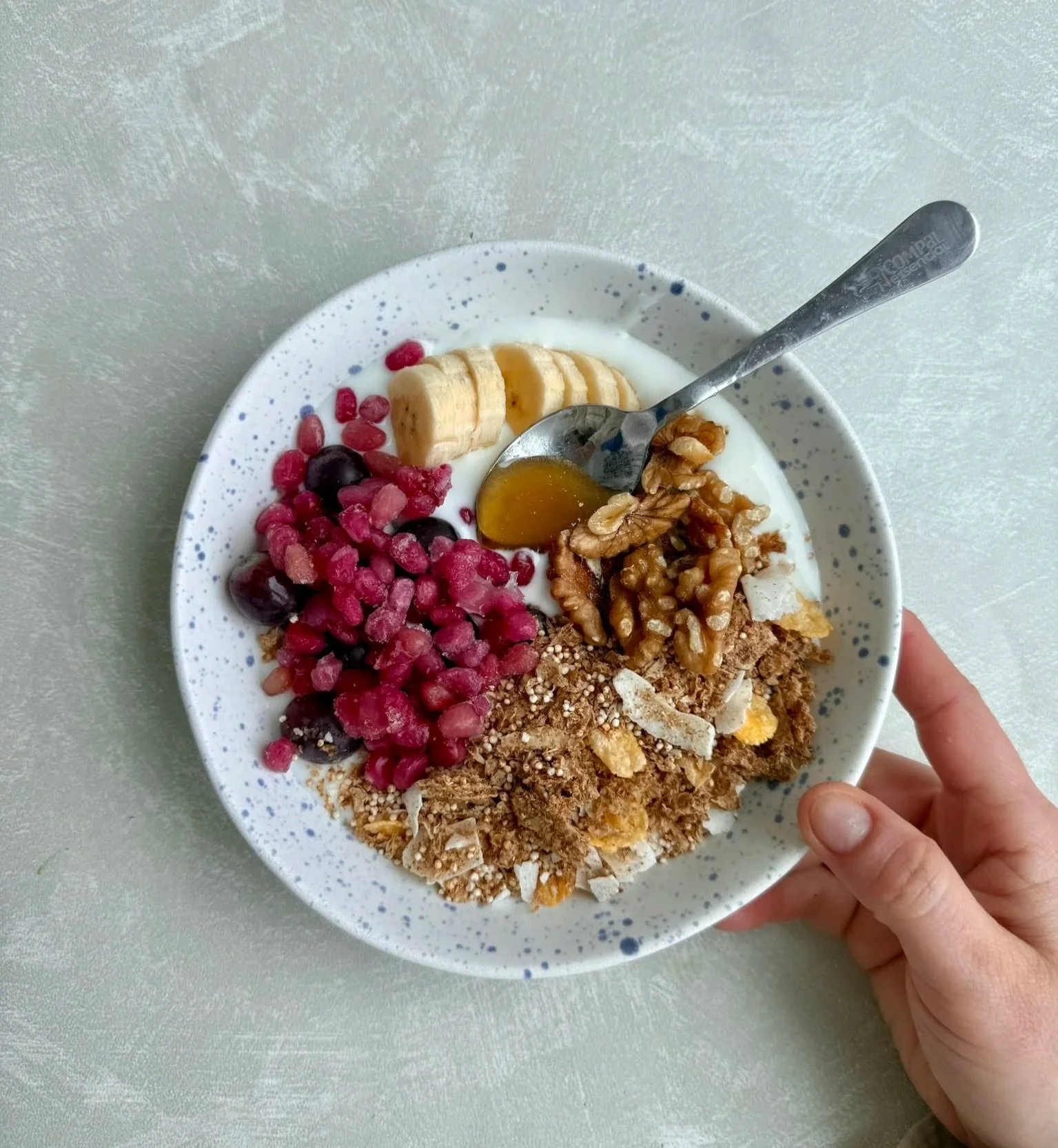 Adicionam cereais a gosto (sem açúcar de preferência), fruta cortada, frutos secos e canela. Se quiserem um bocadinho de mel.