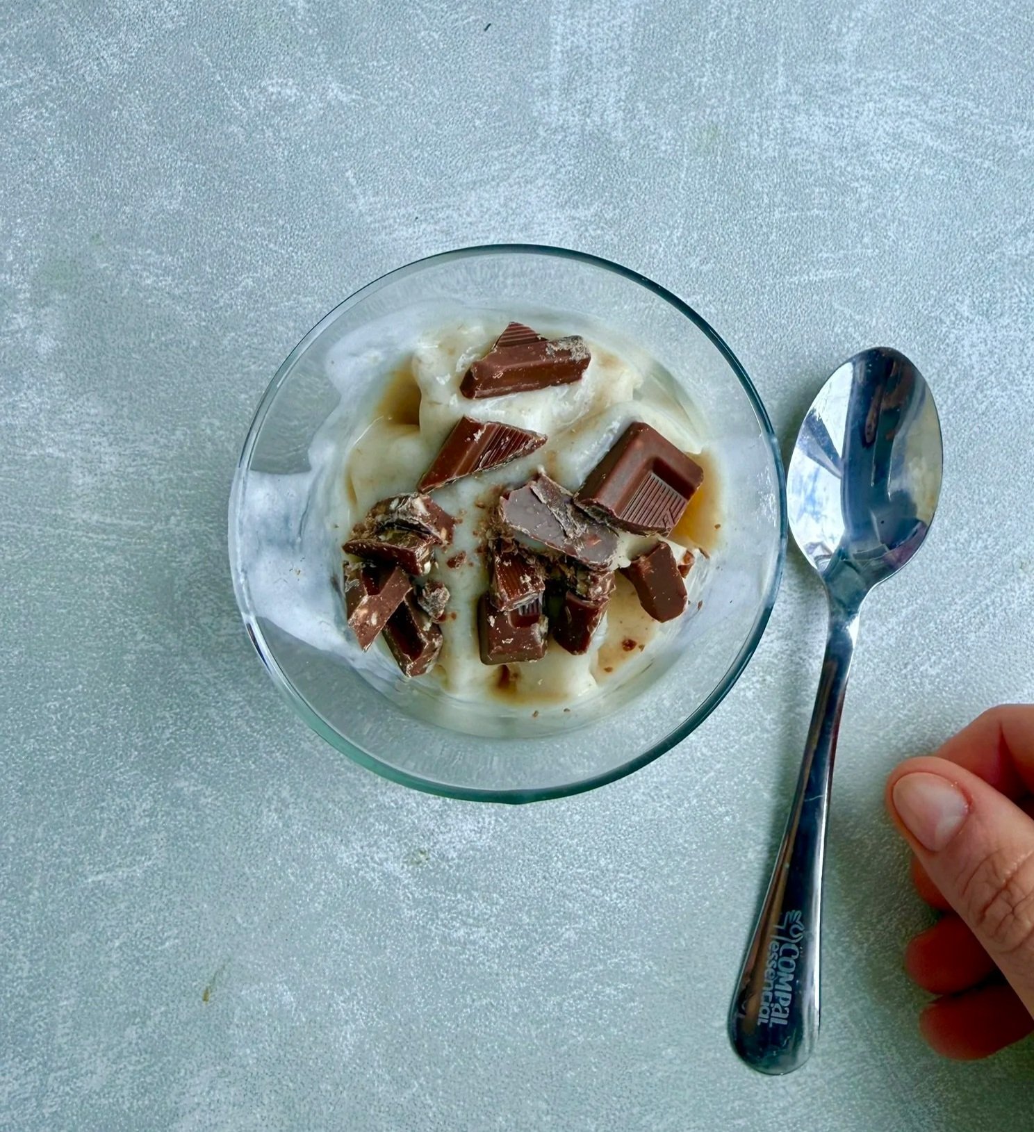 E um gelado que podem fazer facilmente em casa é só triturar fruta congelada (neste caso usei 1 banana) com o kefir.