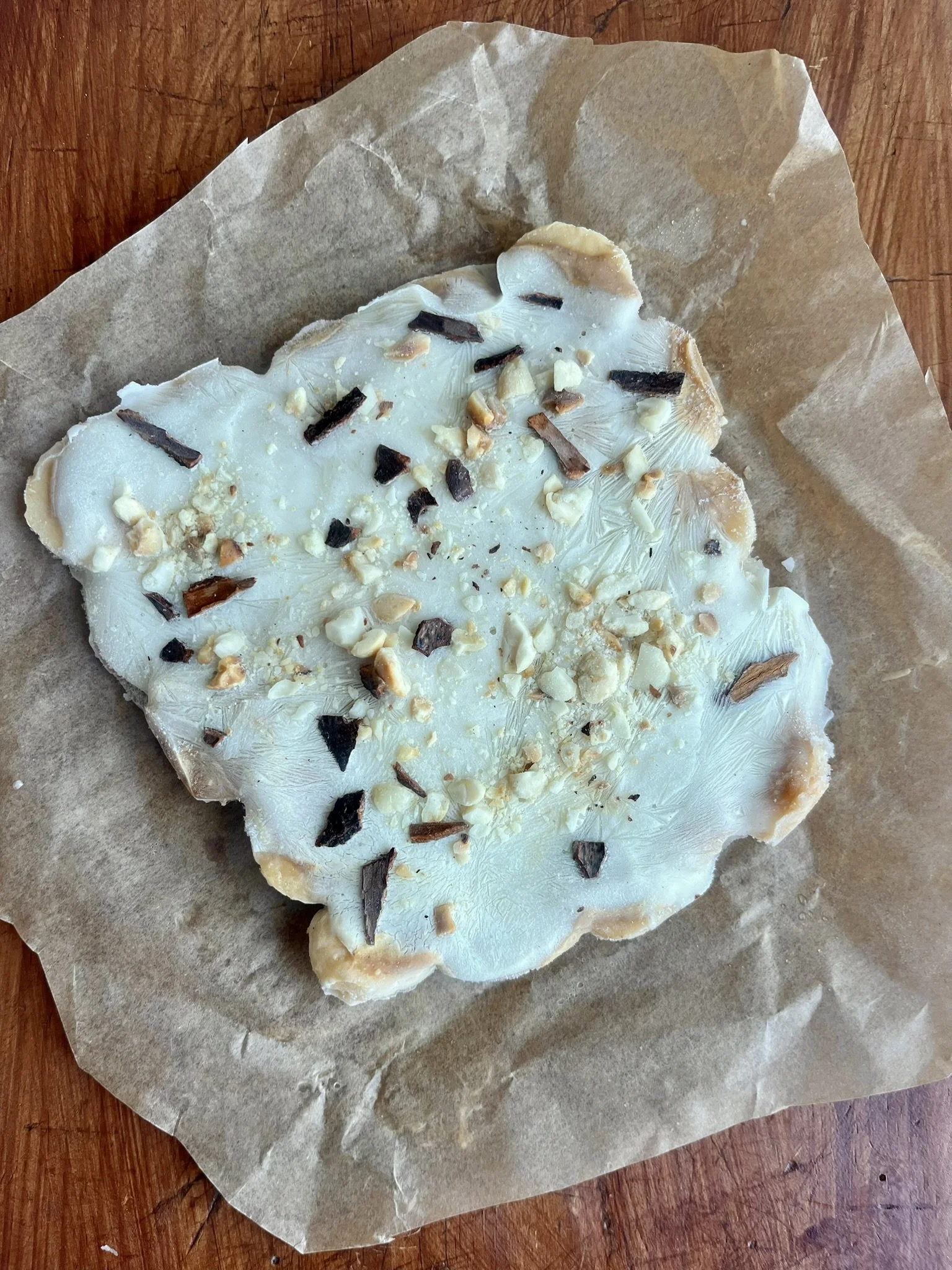 Espalhar no fundo de uma forma, forrada com papel vegetal e levar ao congelador.