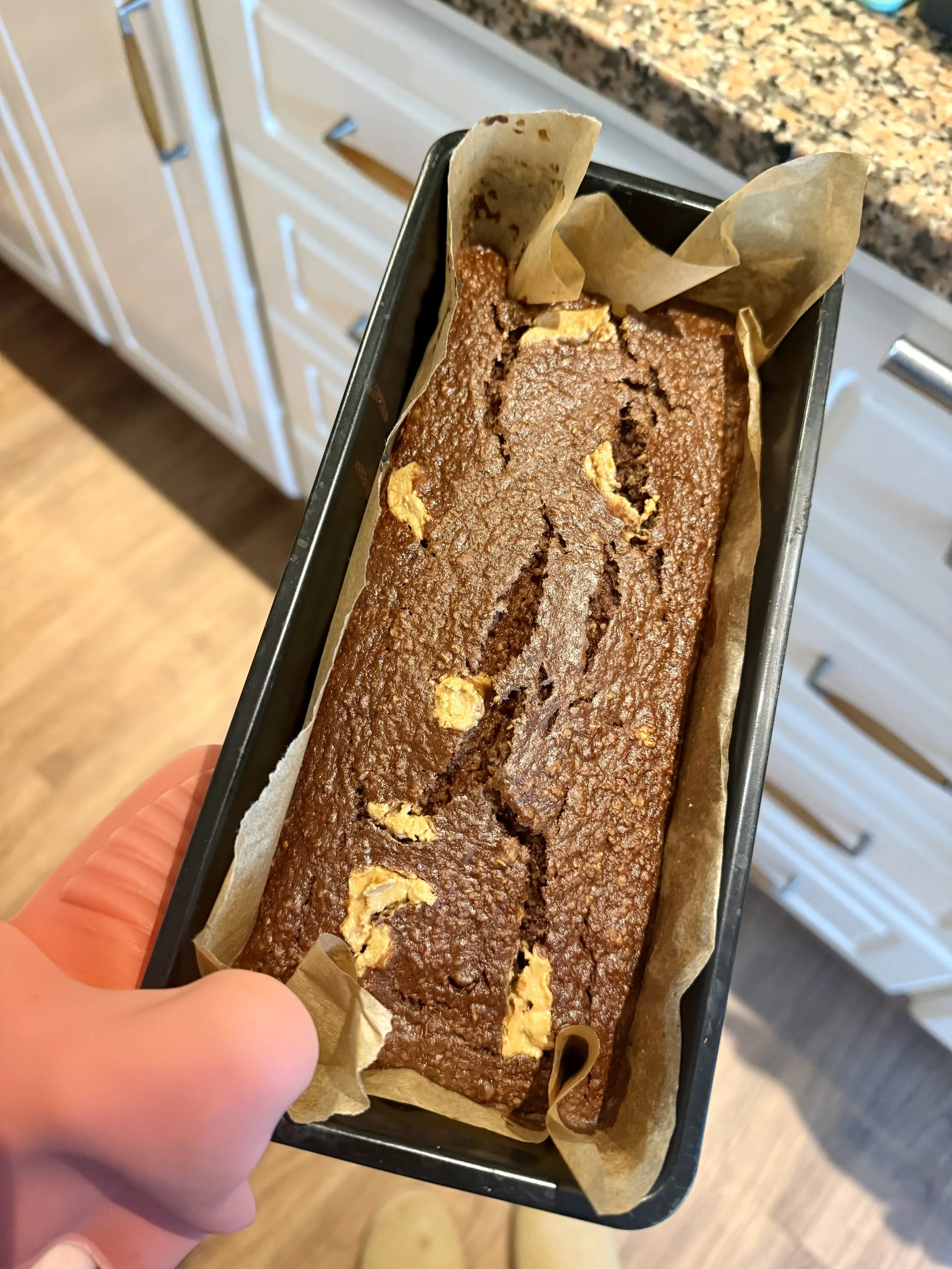 Bater 2 bananas, com 2 ovos e 1 colher de sobremesa cheia de mel. Adicionar 1 chávena de leite magro/bebida vegetal, 2 chávenas de flocos de aveia, 1 chávena de chocolate em pó, 1 colher de chá de fermento em pó, 1 mão de nozes picadas e canela q.b. Envolver.