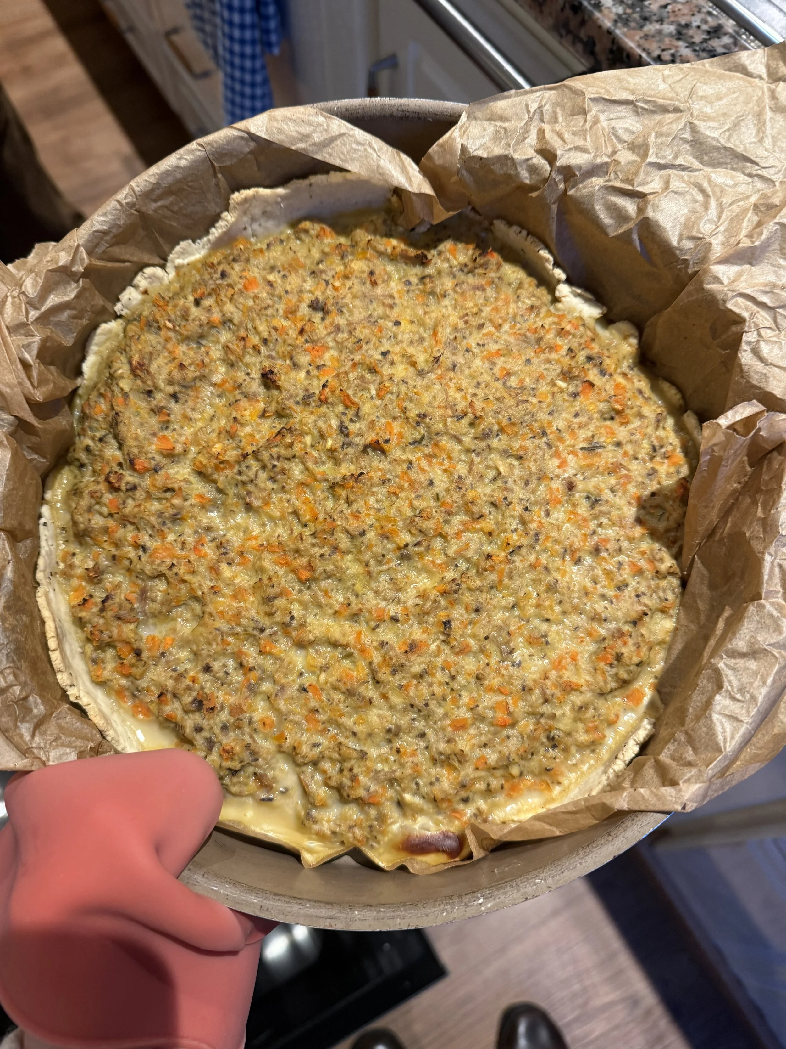 Para aproveitar uma sobra da perna de peru que tinha das marmitas passadas, juntei legumes e preparei esta quiche.