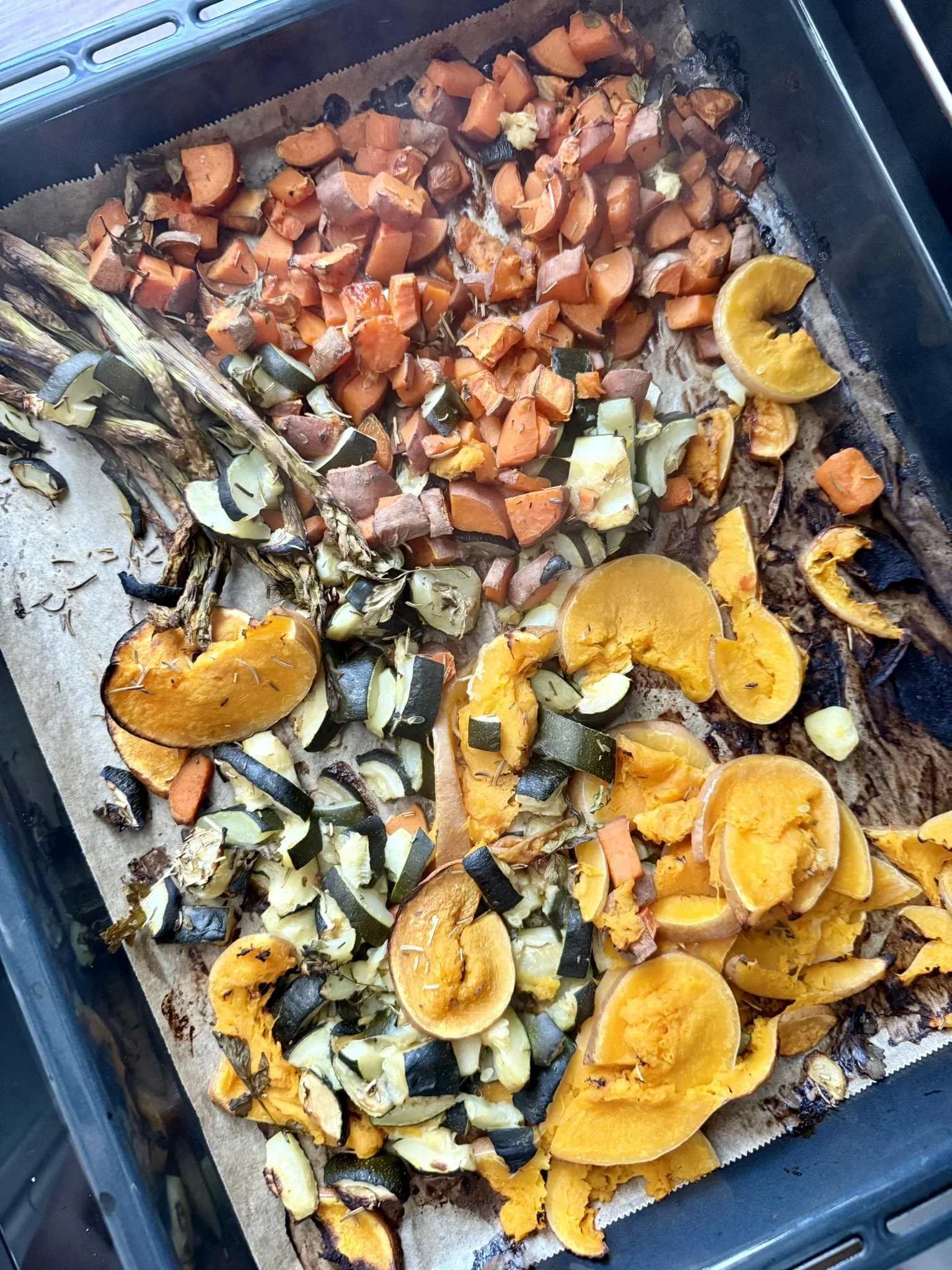 Desta vez usei batata-doce, curgete, espargos e abóbora. Temperei com alecrim e salsa fresca e levei ao forno.