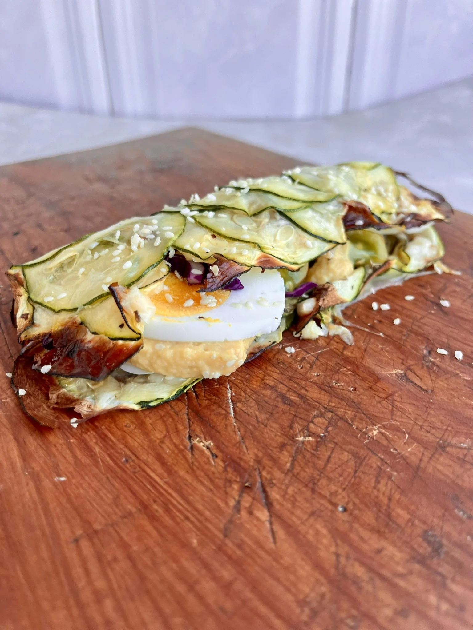 Eu utilizei couve roxa, tomate, ovo cozido e húmus caseiro.